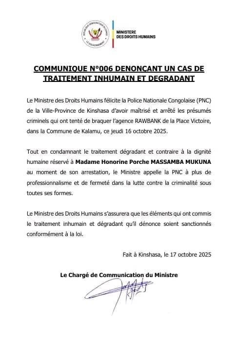 Si Honorine Porsche reste impliquée dans l’enquête sur le braquage spectaculaire d’une agence Rawbank, les ONG de défense des droits humains insistent sur un principe fondamental : aucun suspect ne doit être soumis à la torture ou à des traitements dégradants, quelle que soit la gravité des accusations.