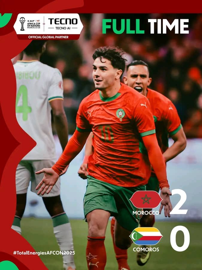Le match inaugural a opposé le Maroc aux Comores au stade Prince Moulay Abdellah, pour le compte du groupe A. Après un penalty manqué à la 10e minute par Soufiane Rahimi, les Lions de l’Atlas ont pris l’ascendant en seconde période. Brahim Díaz a ouvert le score à la 55e minute, avant qu’Ayoub El Kaabi ne double la mise à la 74e, scellant une victoire 2-0 pour le pays hôte.