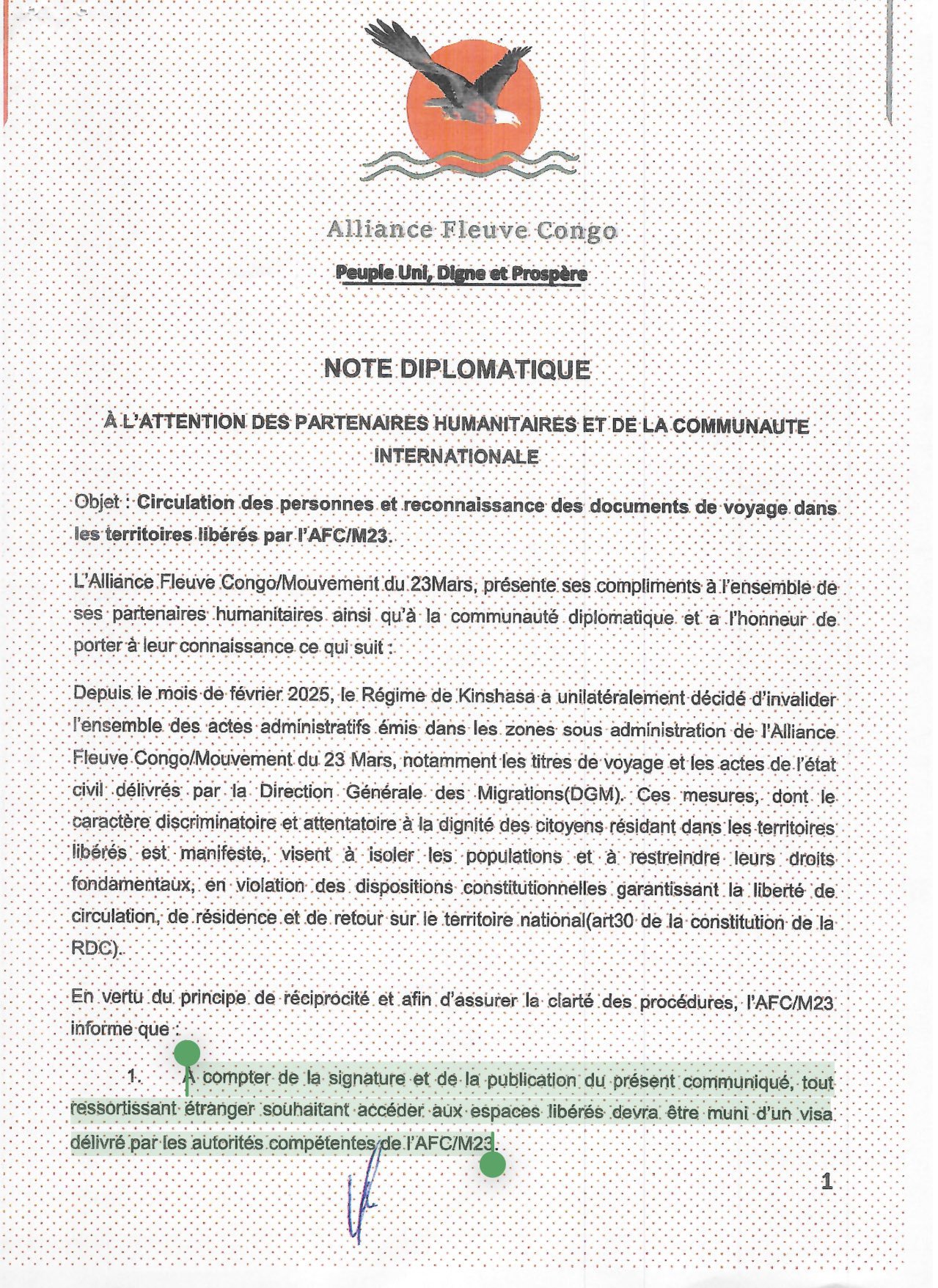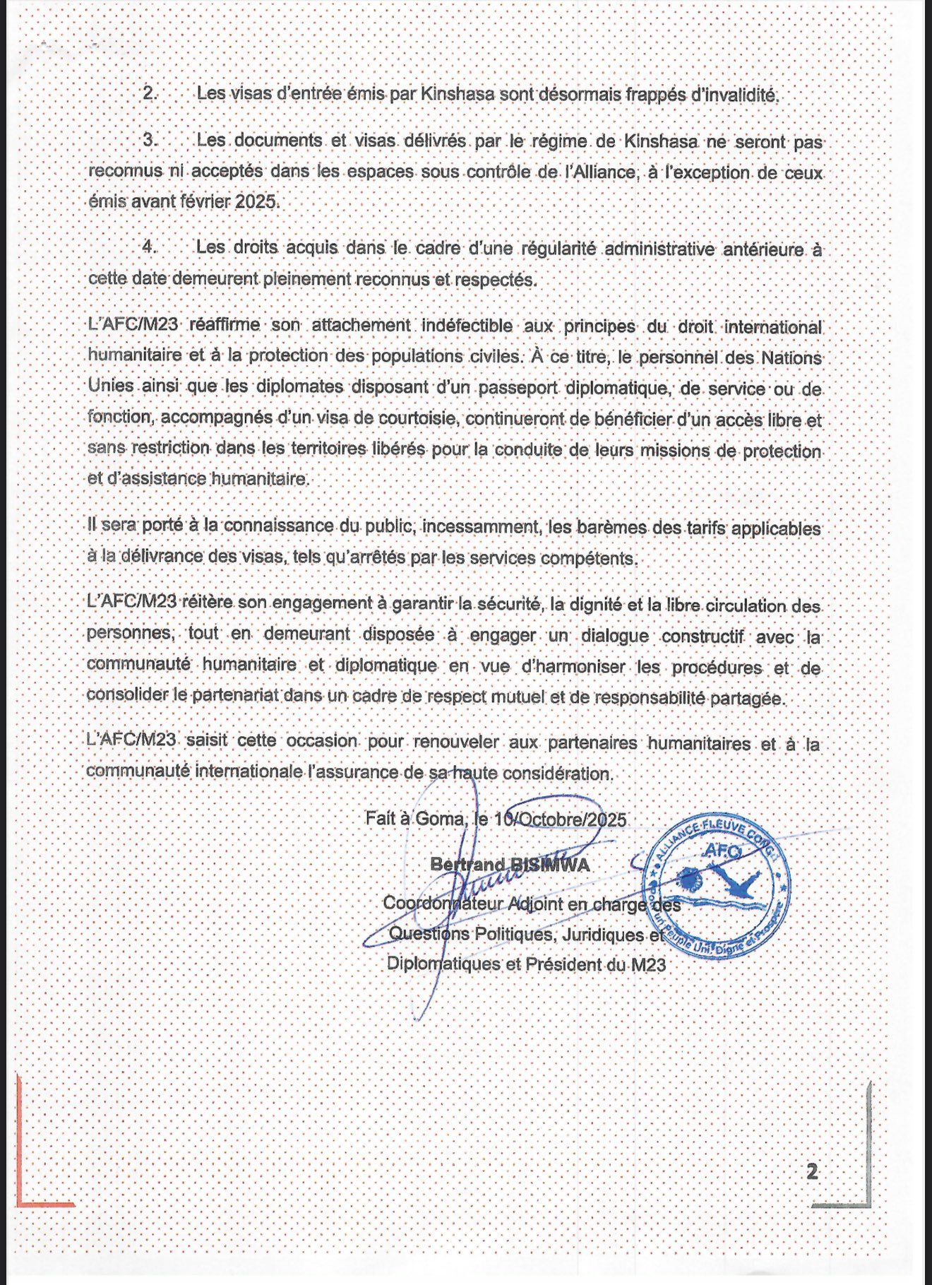 Tout ressortissant étranger souhaitant accéder aux « espaces libérés » c’est-à-dire les zones sous contrôle du M23/AFC devra être muni d’un visa délivré par les autorités compétentes de l’AFC/M23.