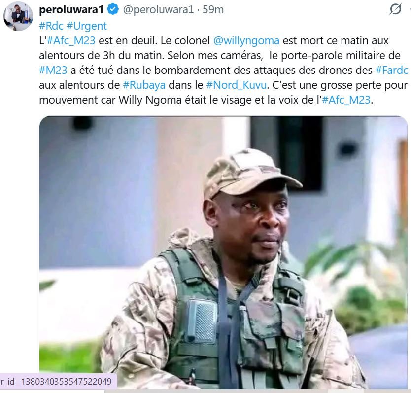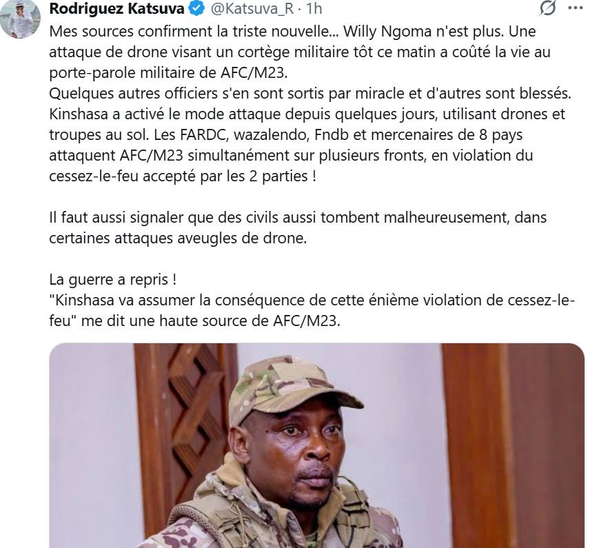 L’information s’appuie sur une publication du journaliste Pero Luwara, selon laquelle le porte-parole militaire du M23 aurait été tué lors de bombardements attribués aux drones des FARDC dans les environs de Rubaya.