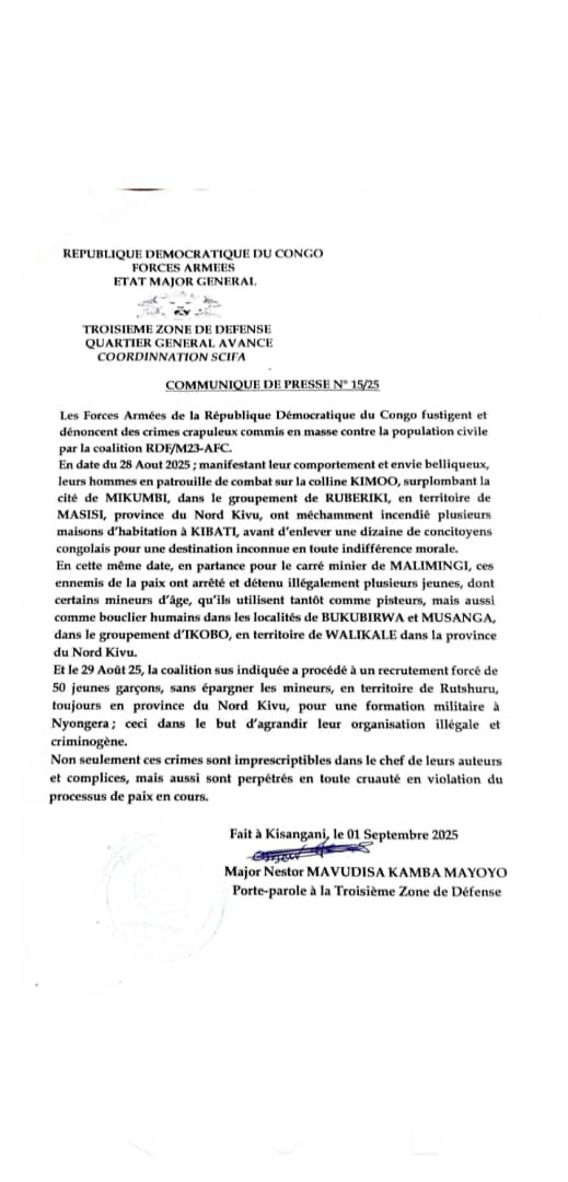 Alors que l’Est de la République démocratique du Congo reste secoué par des violences persistantes, l’armée congolaise a rendu public ce 1er septembre 2025 un communiqué dénonçant une nouvelle vague d’exactions attribuées à la coalition RDF/M23-AFC.