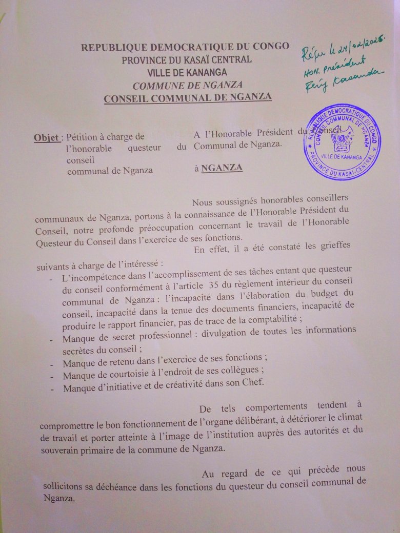 Selon une correspondance adressée au président du Conseil communal, Jery Kasanda, et dont réception a été accusée en date du 24 février 2026, plusieurs griefs sont formulés à l’encontre du questeur. Ces accusations portent notamment sur l’incompétence présumée dans l’exercice de ses fonctions, conformément à l’article 35 du Règlement intérieur du Conseil communal.