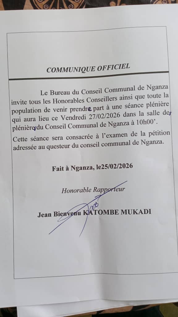 Dans un communiqué rendu public le 25 février 2026, le rapporteur du Conseil communal, Jean Bienvenu Katombe Mukadi, a annoncé que le Bureau convie la population à prendre part à une séance plénière prévue le vendredi 27 février 2026 dans la salle plénière du Conseil communal de Ngânza.