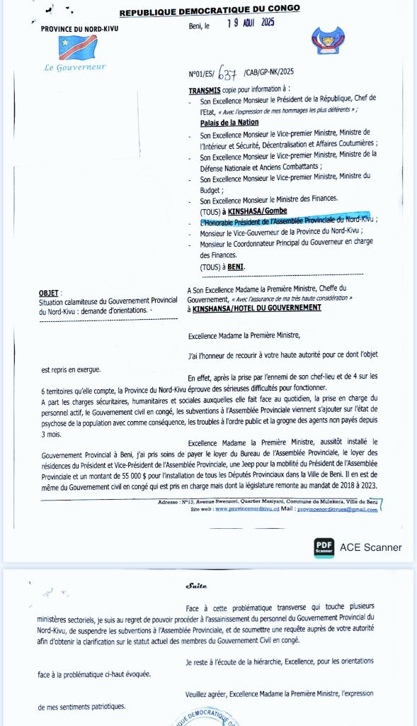 Dans une note adressée à la Première Ministre Judith Suminwa Tuluka, il révèle faire face à une situation financière critique, aggravée par l’absence de dotations et de subventions en provenance de Kinshasa.