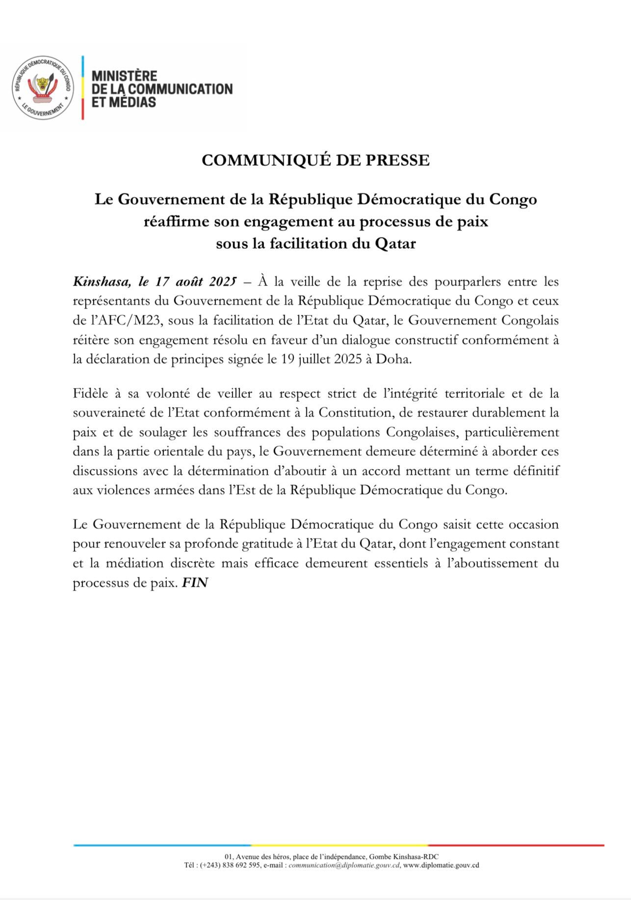 Alors que la reprise des discussions de Doha se profile, le Gouvernement congolais a tenu à réaffirmer publiquement son engagement total dans le processus de paix, tout en insistant sur des principes non négociables : le respect de l’intégrité territoriale et la souveraineté de l’État, comme le garantit la Constitution.