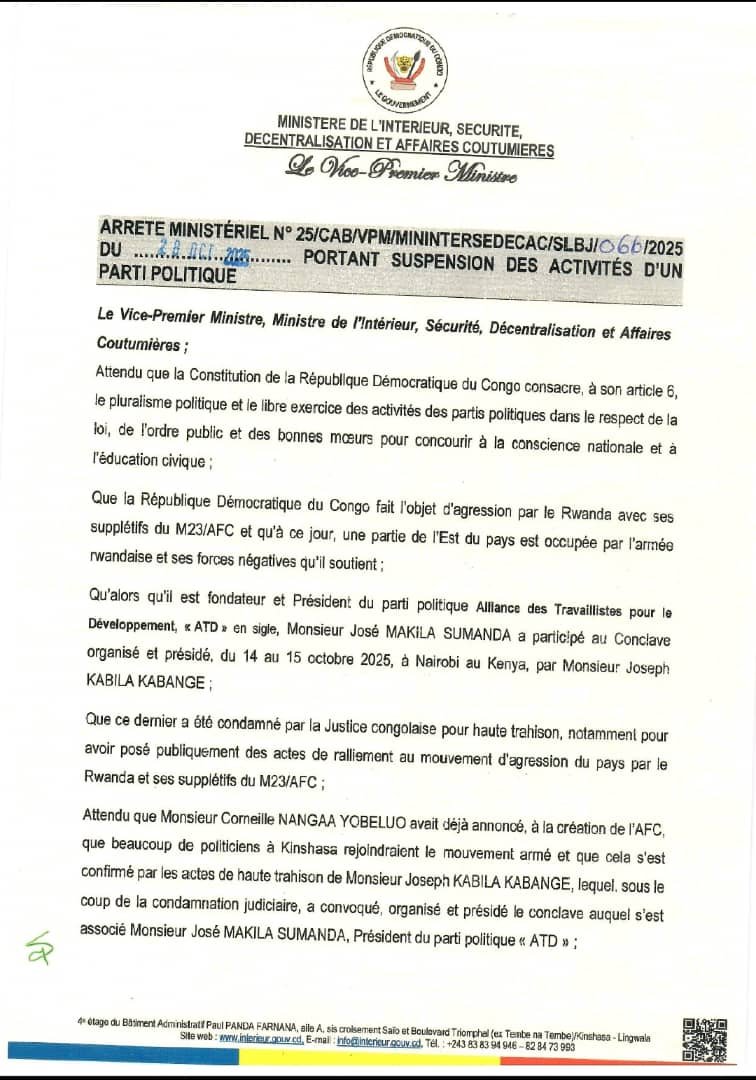 Le gouvernement congolais a annoncé la suspension immédiate des activités du parti politique Alliance des Travaillistes pour le Développement (ATD), dirigé par José Makila Sumanda, figure de l’opposition.