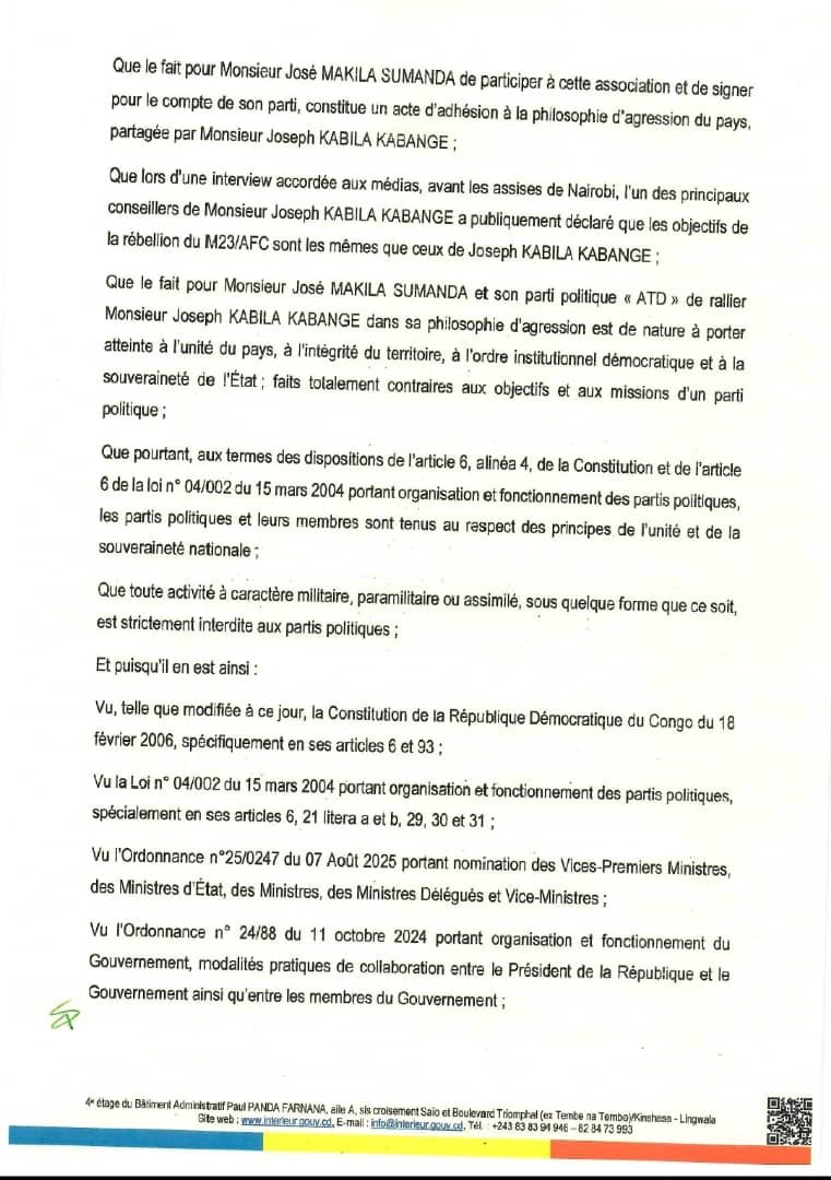 Selon le document officiel consulté, cette mesure fait suite à la participation de José Makila au conclave de Nairobi, tenu du 14 au 15 octobre 2025 sous la présidence de Joseph Kabila Kabange, ancien chef de l’État congolais.