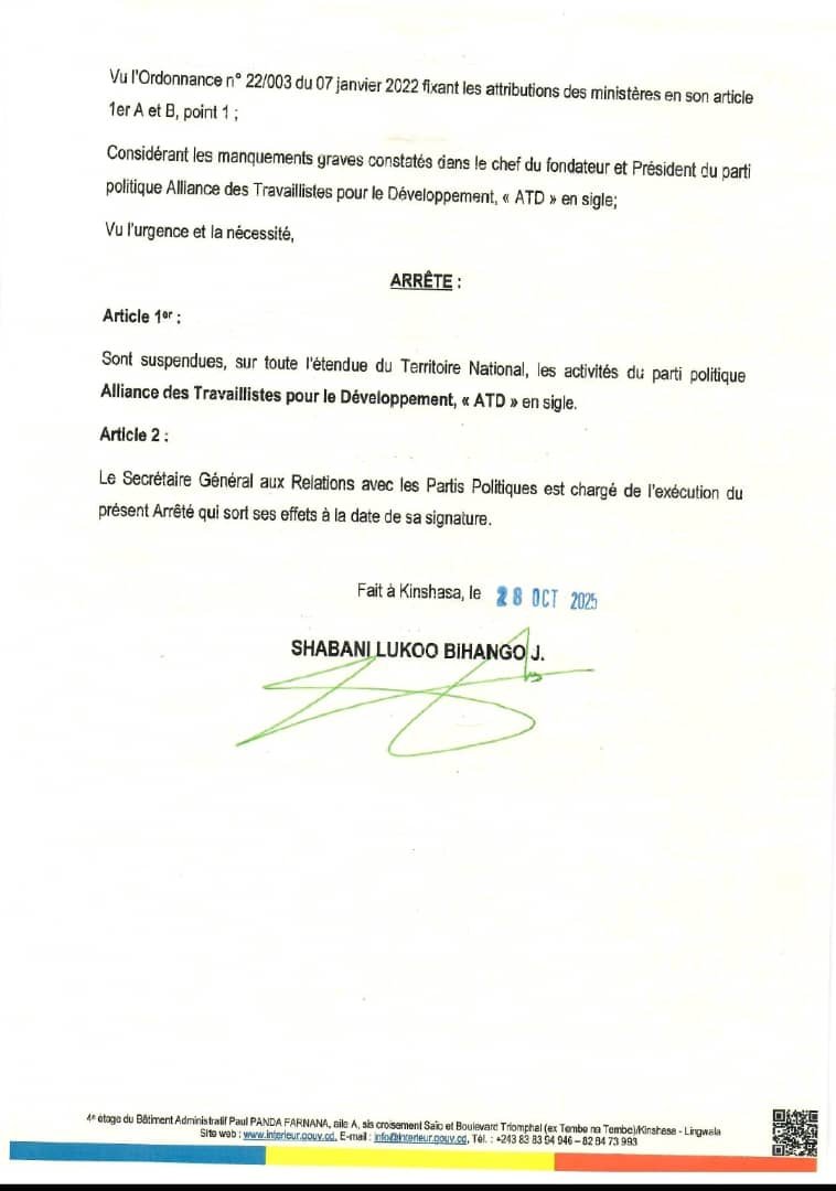 La décision a été officialisée à travers un arrêté ministériel signé le 28 octobre 2025 par le Vice-Premier ministre, ministre de l’Intérieur, de la Sécurité, de la Décentralisation et des Affaires coutumières, Shabani Lukoo Bihango.