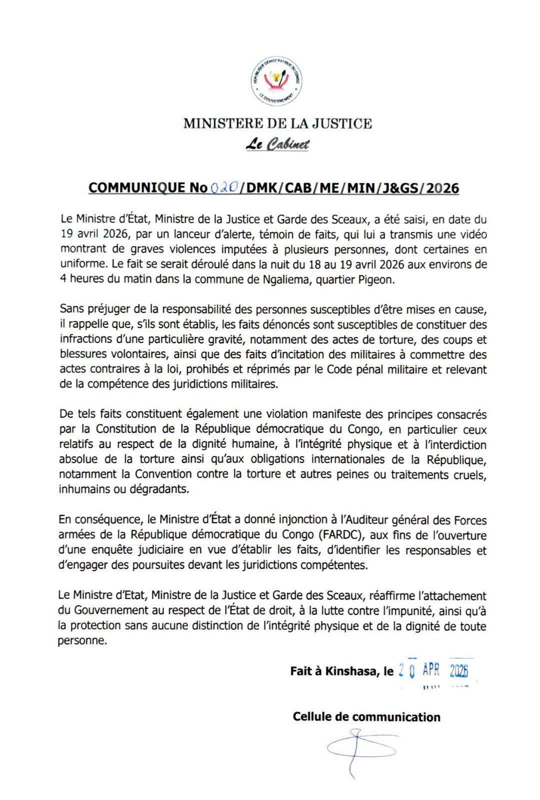 Selon un communiqué officiel publié par le cabinet du ministre, ces faits auraient été signalés le 19 avril 2026 par un lanceur d’alerte ayant transmis une vidéo montrant des violences imputées à plusieurs personnes, dont certaines en uniforme.