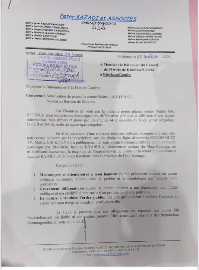 Dans une lettre datée du 25 août 2025, le cabinet « Peter Kazadi et Associés » accuse Maître Kitenge d’avoir proféré de graves imputations dommageables à l’endroit de Maître Kazadi lors d’une émission diffusée sur la chaîne en ligne CONGO BUZZ TV.
