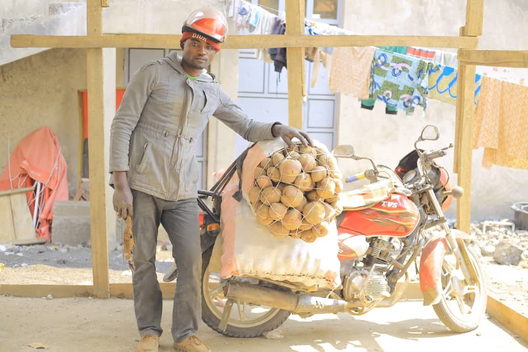 Nous sommes à Ngungu, à une cinquantaine de kilomètres de Goma, où chaque jour des dizaines de motards bravent la boue, les pentes raides et les pannes pour transporter les “birayi” (pommes de terre) vers le dépôt central de l’entreprise ASMOVC, une organisation qui encadre et soutient ces acteurs du commerce vivrier.