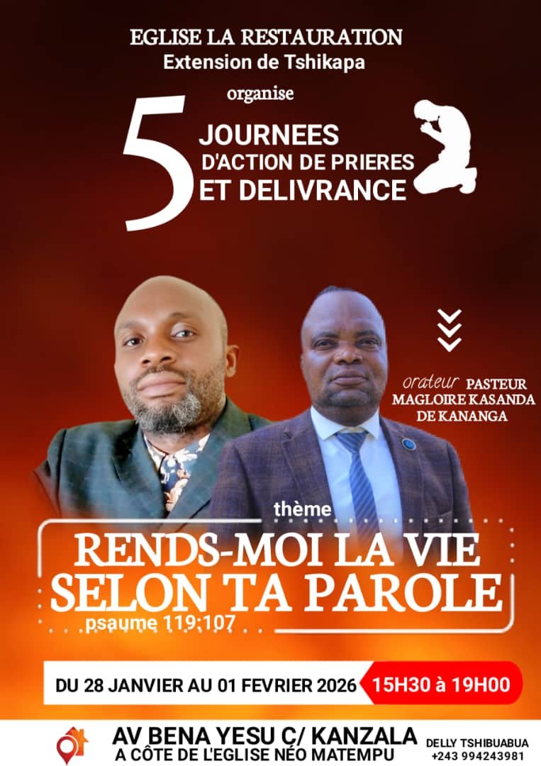 L’Église La Restauration – Extension de Tshikapa annonce l’organisation de cinq journées d’action de prières et de délivrance, prévues du 28 janvier au 1er février 2026, de 15h30 à 19h00, dans la ville de Tshikapa, province du Kasaï.