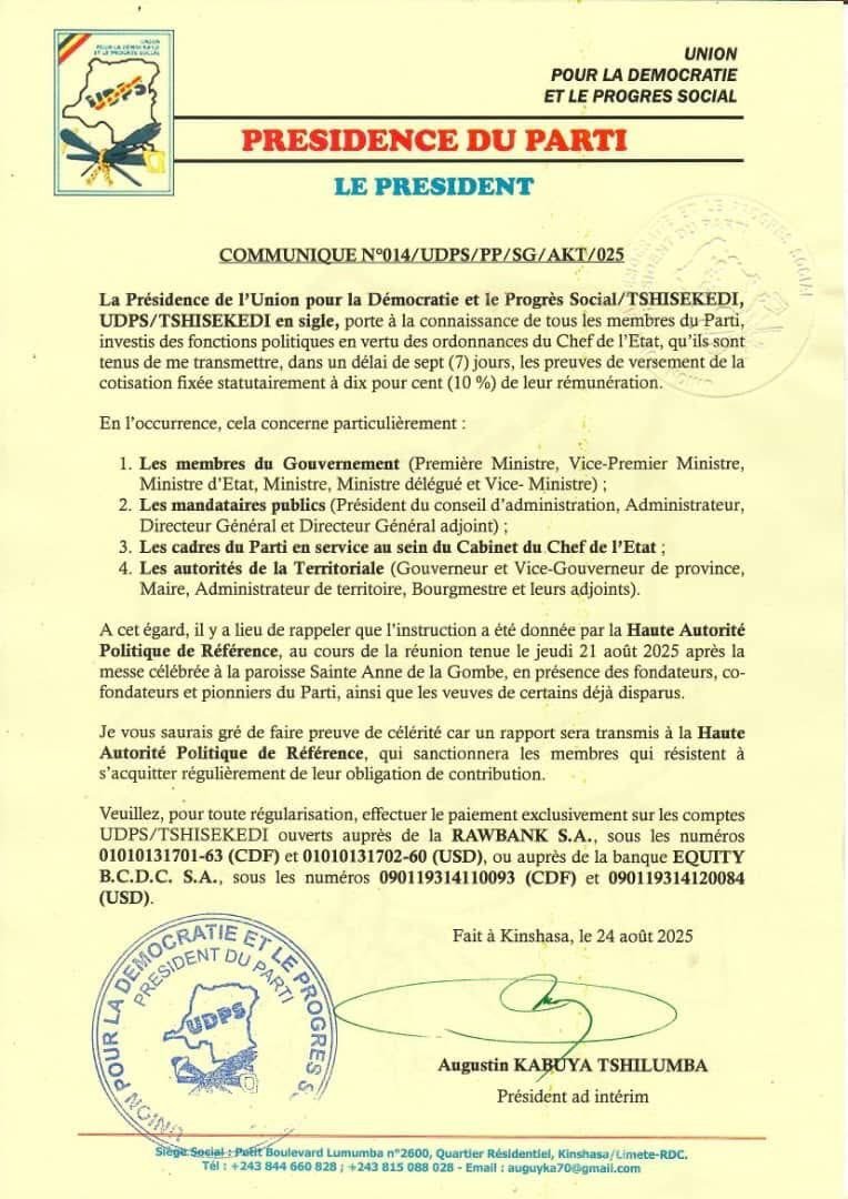 Conformément aux statuts internes de l’UDPS, chaque membre investi dans une fonction publique – qu’il s’agisse de la Première ministre, des vice-premiers ministres, des ministres, des gouverneurs, des mandataires publics ou de tout autre cadre nommé – est tenu de verser 10 % de sa rémunération mensuelle au parti. Ce prélèvement constitue une cotisation obligatoire, visant à renforcer l’autonomie financière de l’UDPS et à permettre le bon fonctionnement de ses structures.